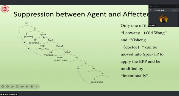 报告中,韩斌结合不同语言句法研究的成果分析了汉语中的蒙事主语句子结构,提出汉语句首位置的蒙事主语为一种施用论元结构,从语义和语用两个方面分析了这种蒙事主语表达的必要性和原因,最后从句法方面分析了蒙事主语句子结构的生成机制,论证了蒙事主语句式在语义层面和句法深层结构层面的对应性。